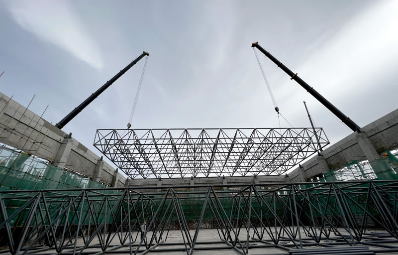 · 核心技術(shù):液壓同步提升技術(shù)。計算機系統(tǒng)精確控制每個點的提升速度和行程,確保網(wǎng)架在上升過程中保持同步,受力均勻,避免結(jié)構(gòu)變形。